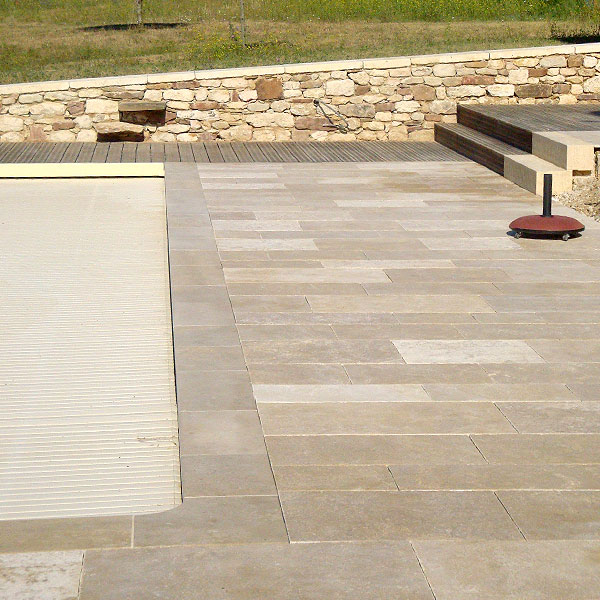 Pose de dallage en calcaire régional pour terrasse extérieur, plages de piscines, margelles et dessus de murs. Avec une étude de votre projet et calepinage.